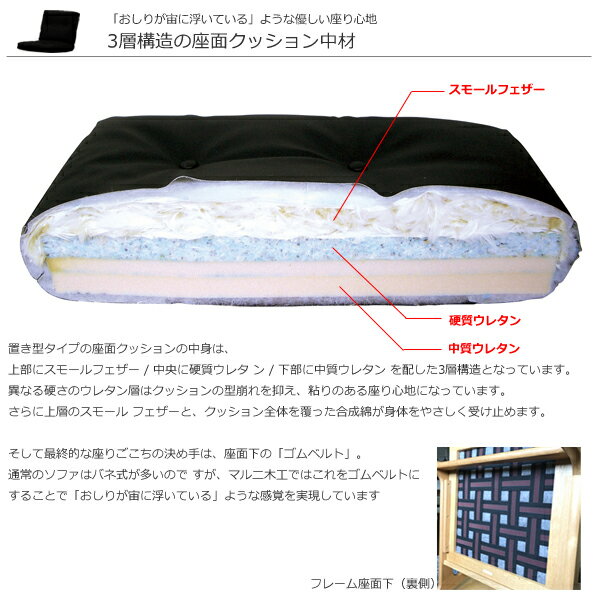 異なる硬さのウレタン層はクッションの型崩れを抑え、粘りのある座り心地になっています。