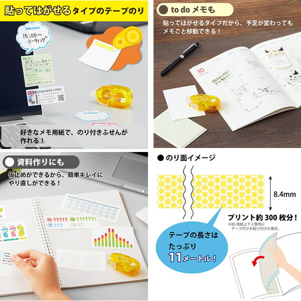 ●テープ状ののりなので、ベタつかず、乾く時間を待たずに接着でき、手やまわりも汚しません。
